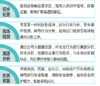 在政企单位遇到网络安全攻击时,第一时间予以响应,协助单位采取紧急措施、将业务恢复到正常服务状态,并调查、分析、研判安全事件发生的原因