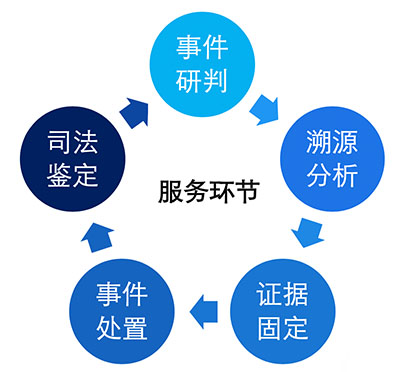 作为应急响应工作的最后一环,从事件研判、溯源分析、证据固定、事件处置、司法鉴定五个环节为客户提供完整的安全事件响应机制。