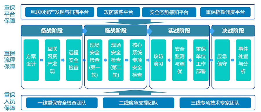 在重大活动或会议期间,为关键信息基础设施提供重保组织架构设计、安全评估、指导修复、积极防御、攻防演习、实时监测、安全值守、响应处置等一系列安全服务